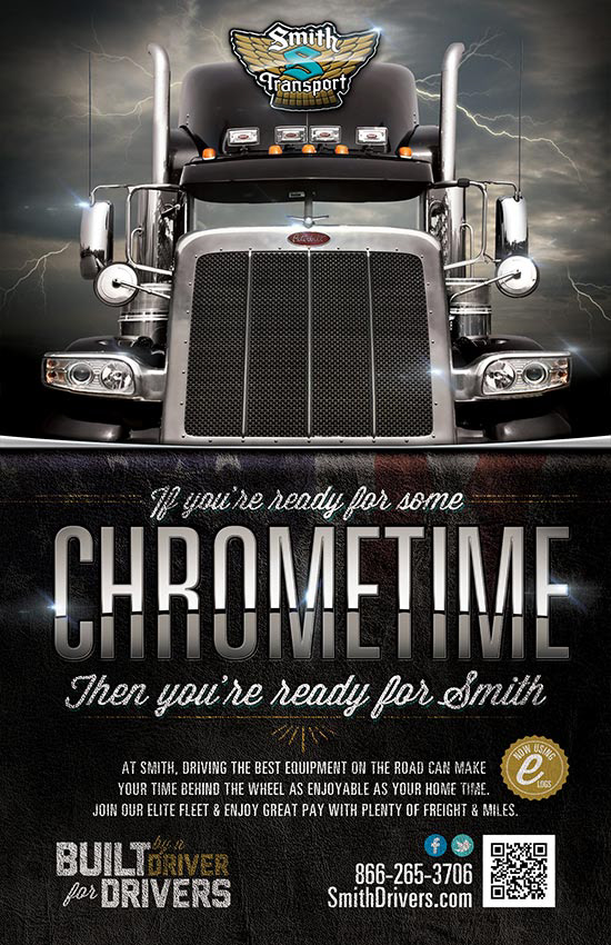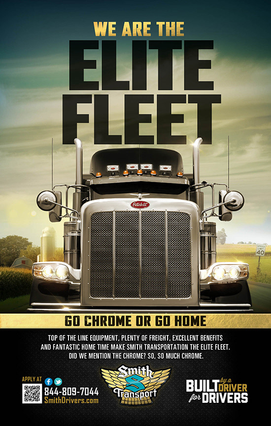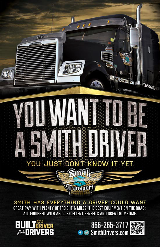 These are a series of publication ads for Smith Transport, located in Roaring Spring, PA. Smith always requests advertising that showcases the benefits of working for their company, particularly the quality and style of the equipment they provide. The goal of these campaigns was to make a bold statement, and attract drivers to the positive aspects of working for Smith Transport.
